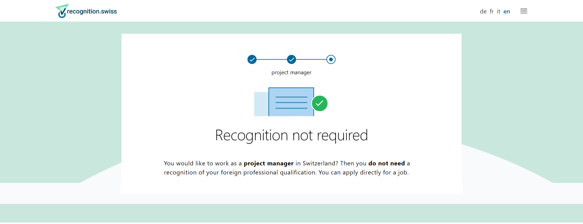Văn bằng SwissUK do SIMI cấp được công nhận khi làm việc tại Thụy Sĩ mà không cần thêm bất kỳ thủ tục bổ sung nào, vì vị trí Project Manager thuộc nhóm nghề nghiệp không yêu cầu giấy phép hành nghề.