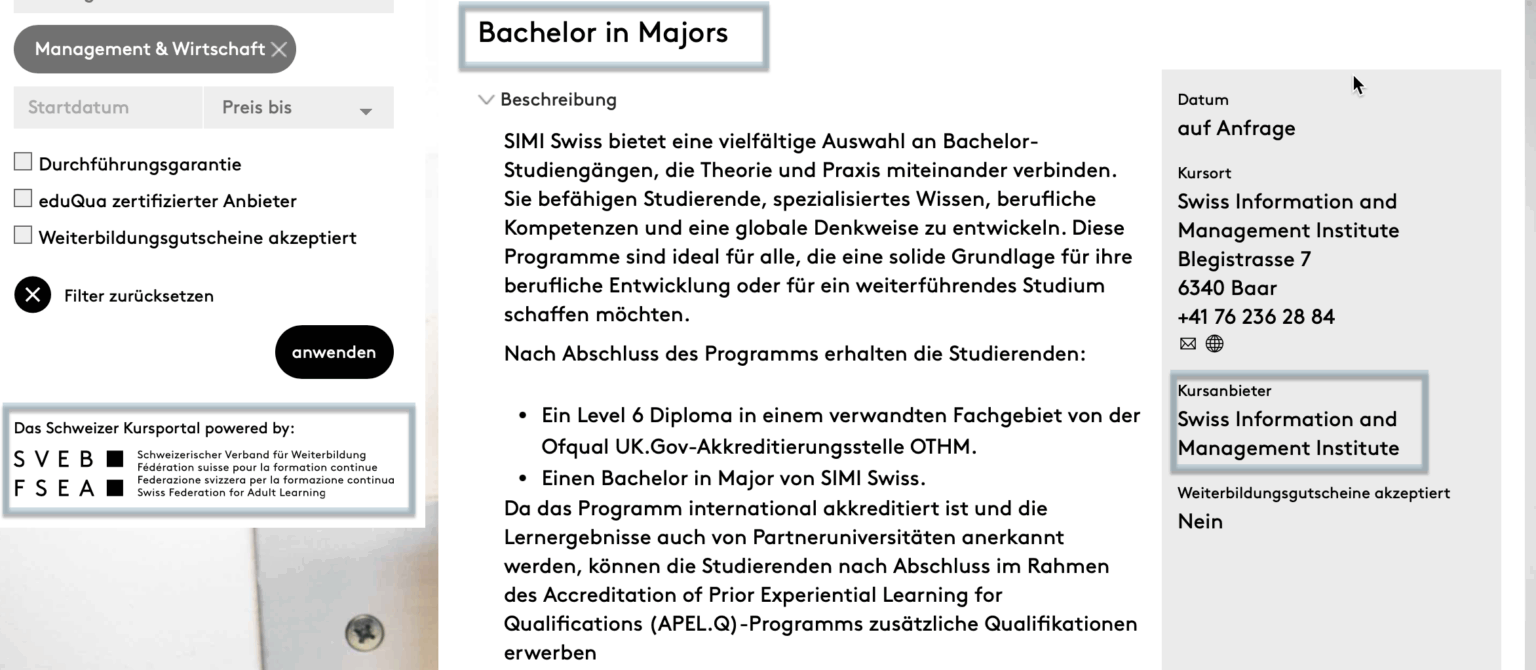 Chương trình Cử nhân của SIMI Swiss được công khai trên Cổng Giáo dục Quốc gia dành cho người trưởng thành tại Thụy Sĩ. Việc công bố này không chỉ giúp học viên dễ dàng tra cứu thông tin, mà còn cho phép chính phủ và các bên liên quan giám sát minh bạch mọi quy chuẩn của chương trình.