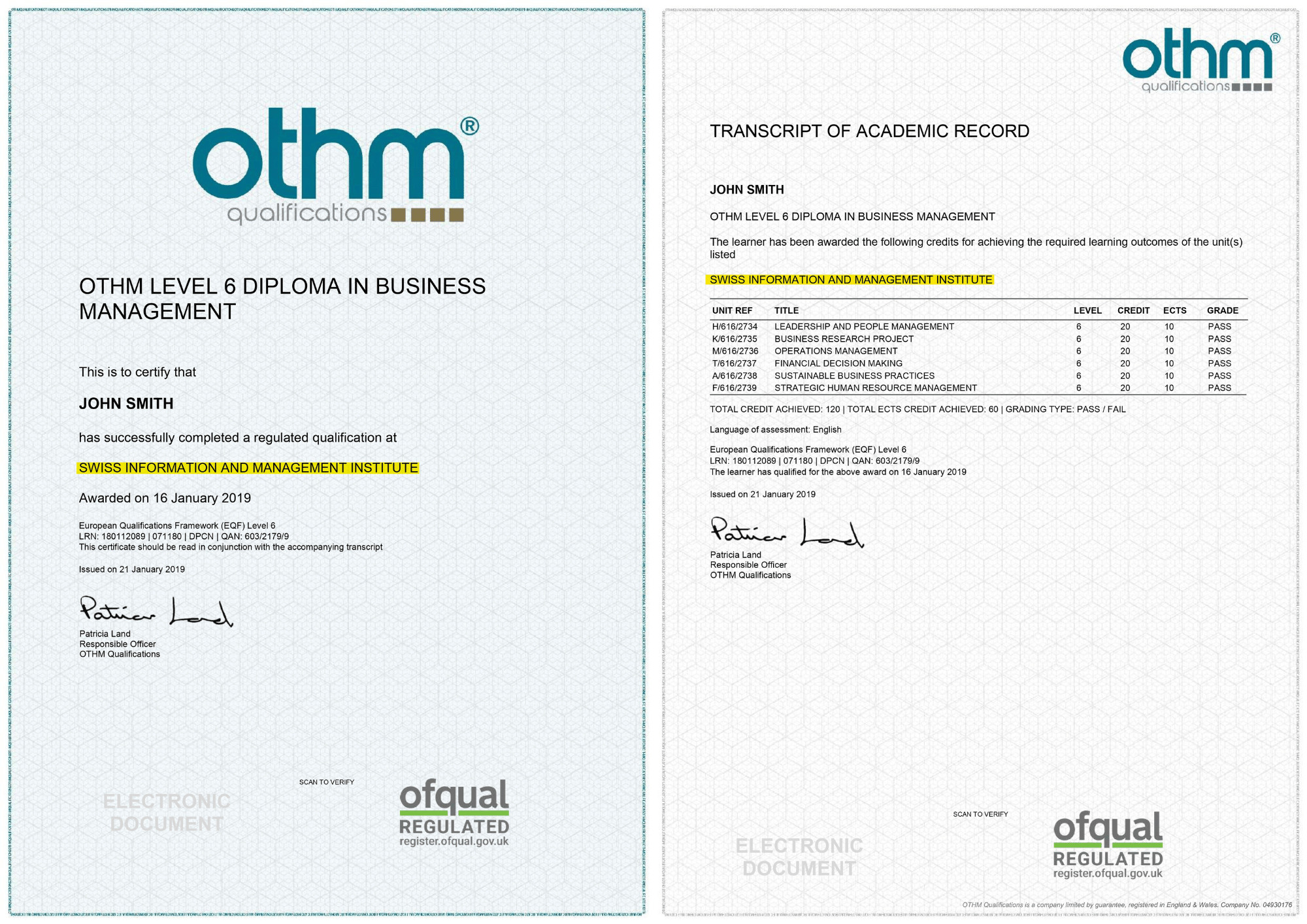 Bên cạnh Private Degree do SIMI Swiss cấp, học viên BBA còn nhận thêm Level 6 Diploma in Business Managementdo OTHM (tổ chức được Ofqual – Chính phủ Anh điều tiết) cấp.