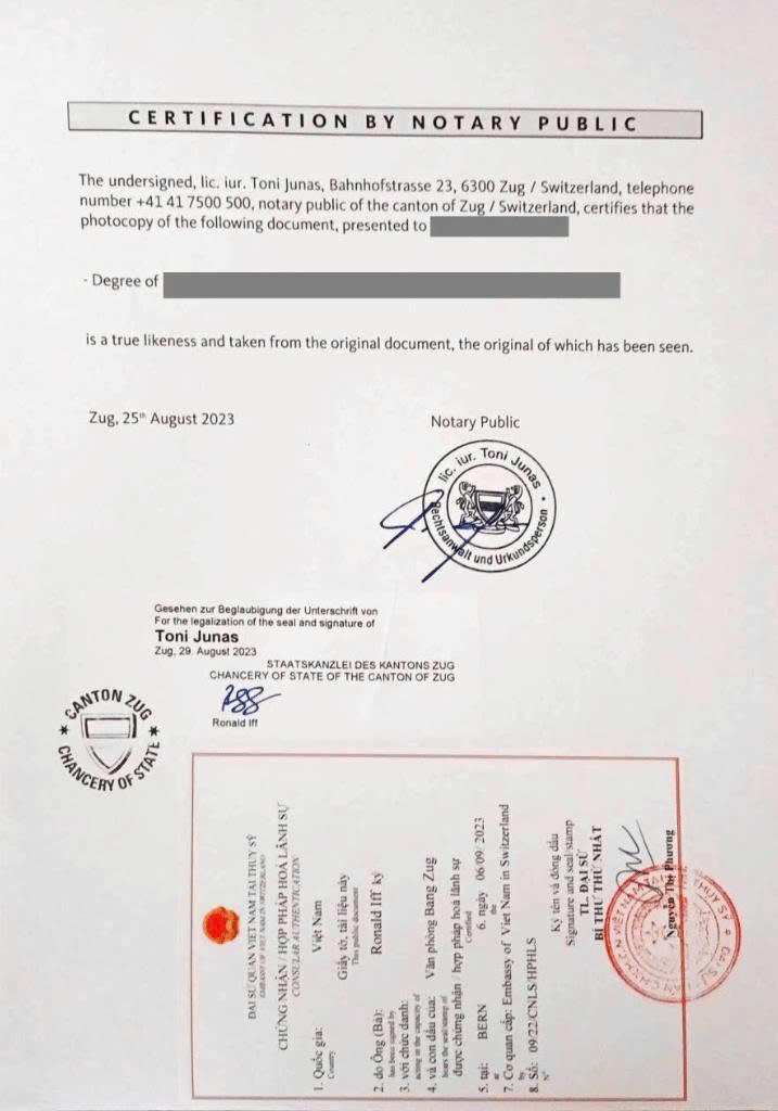 - Hợp pháp hóa bởi Lãnh sự quán Việt Nam tại Thụy Sĩ, xác nhận giá trị pháp lý của trường và văn bằng.