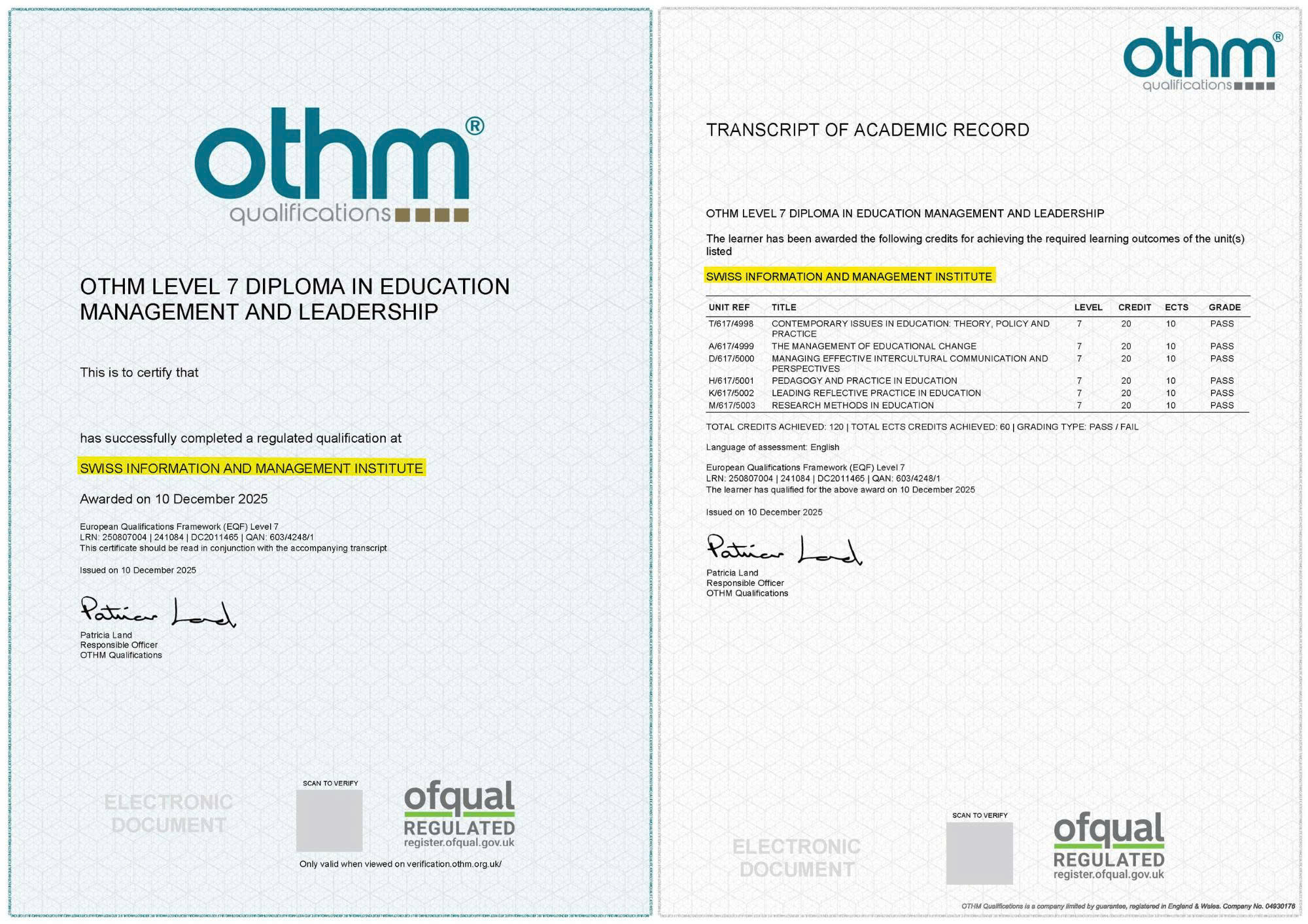 - Level 7 Diploma in Education Management & Leadership từ OTHM (Công nhận bởi chính phủ Anh Quốc, xếp vào Band 12 UK ENIC/NARIC tương ứng Thạc sĩ).