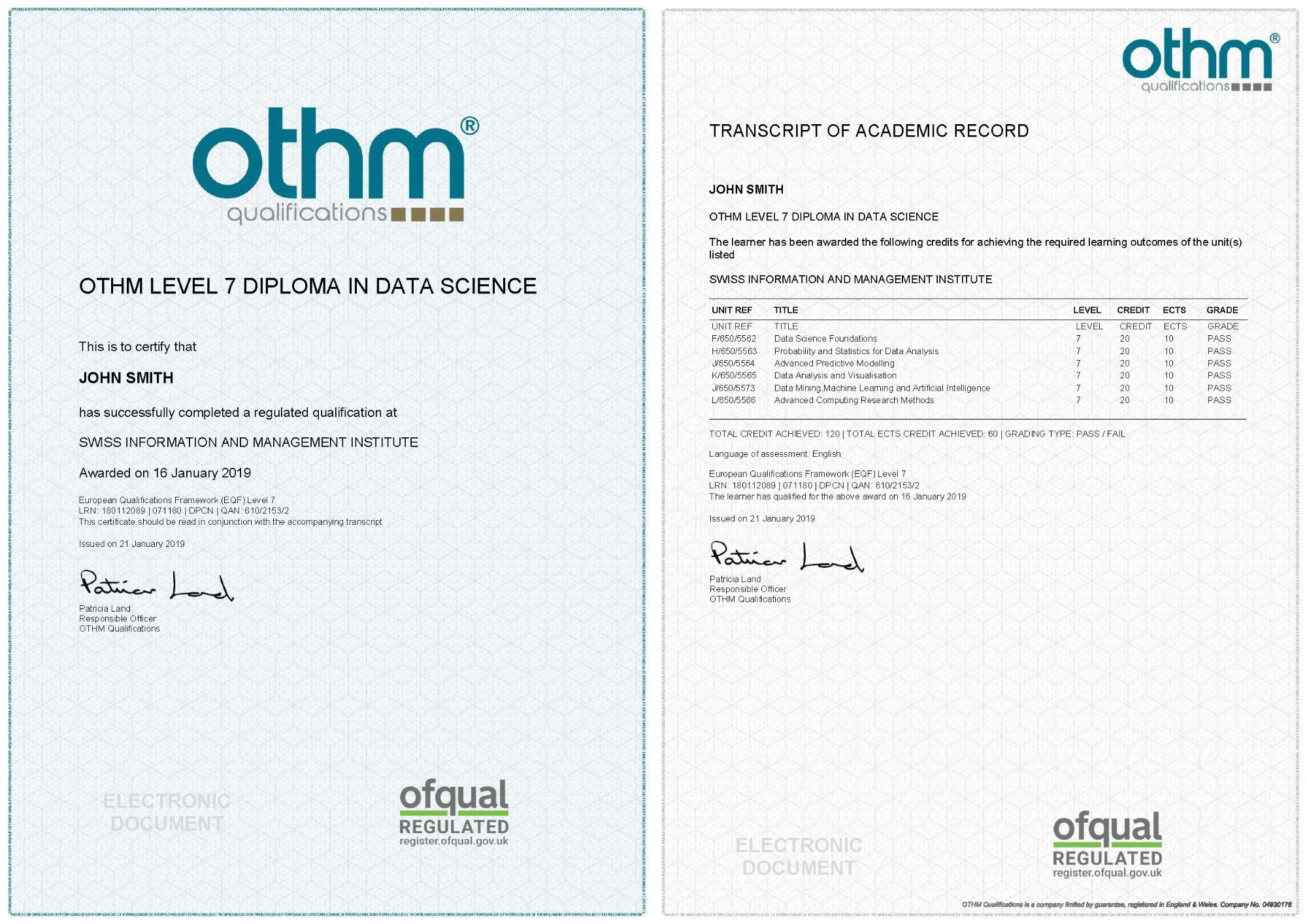- Level 7 Diploma in Data Science – cấp bởi OTHM (Vương quốc Anh).