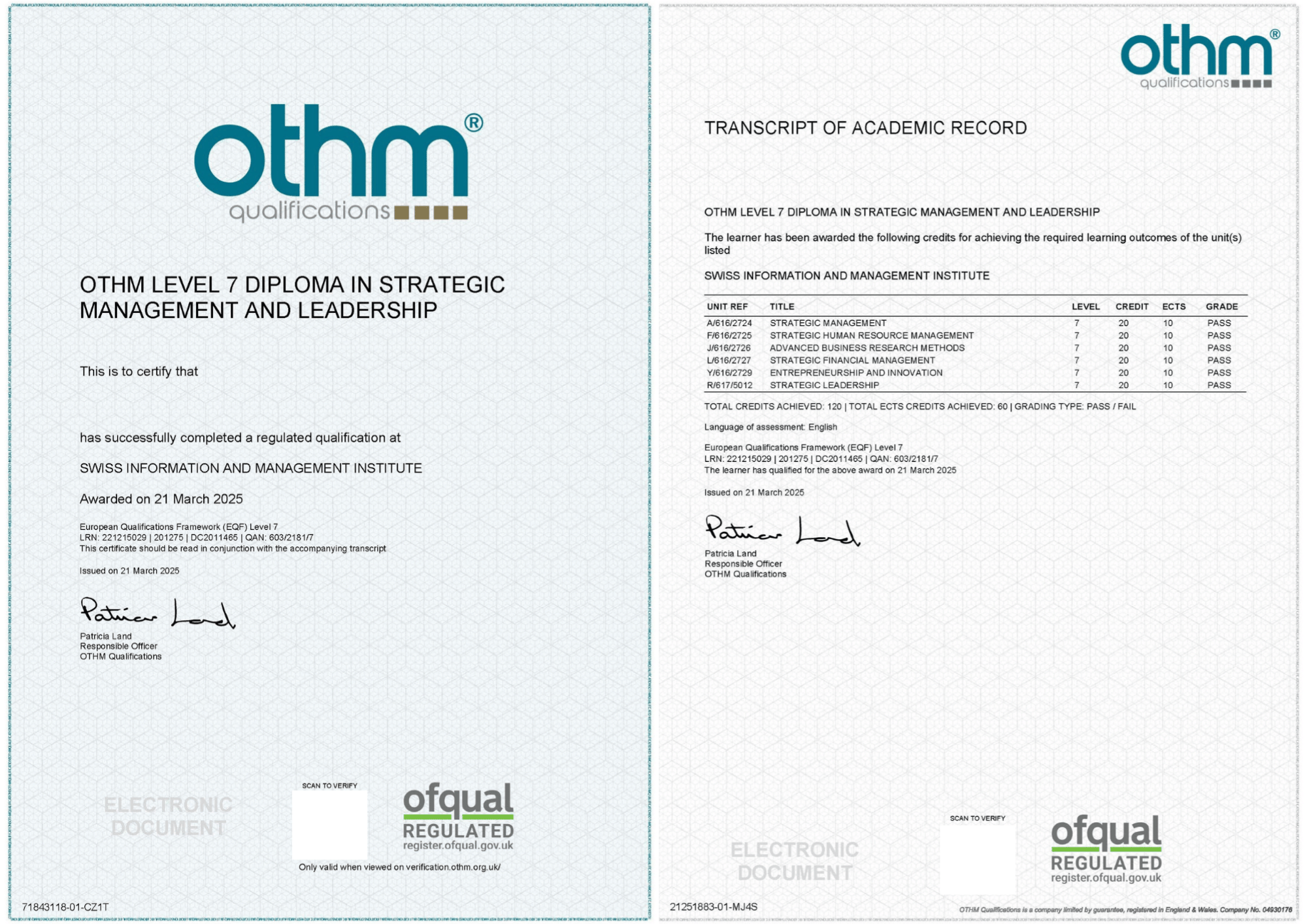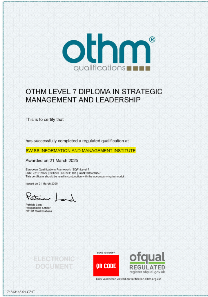 1. Level 7 Diploma in Strategic Leadership and Management – cấp bởi OTHM (Vương quốc Anh).