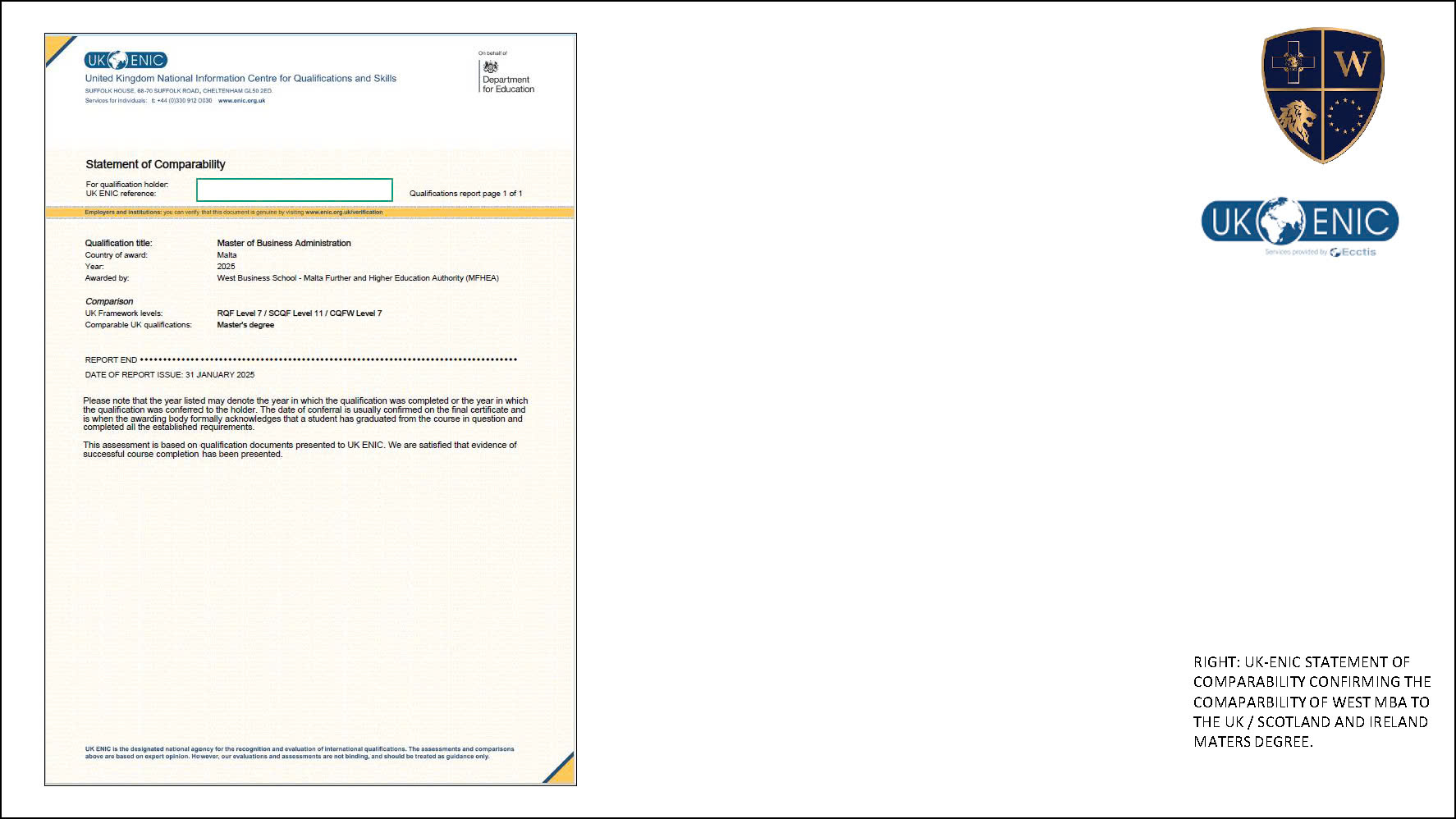 • MBA của West Business School được công nhận tương đương với bằng Thạc sĩ của Vương quốc Anh, Scotland và Ireland theo tuyên bố so sánh (recognized) của UK ENIC; tương đương với bằng Thạc sĩ Canada và Hoa Kỳ  theo hệ thống công nhận của WES; và tương đương với bằng Thạc sĩ New Zealand theo tuyên bố xác minh của NZQA.