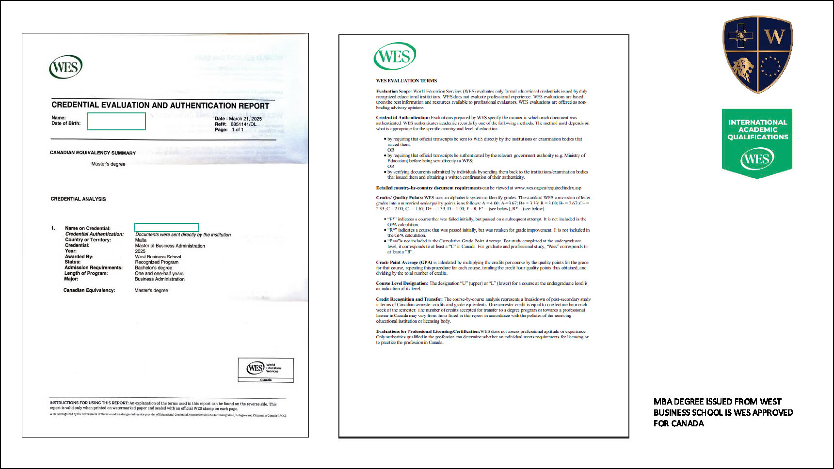 • West Business School là một cơ sở giáo dục đại học và sau đại học được công nhận cấp quốc gia Malta, công nhận bởi hệ thống kiểm định quốc gia MQF, công nhận văn bằng tương đương toàn Châu Âu.